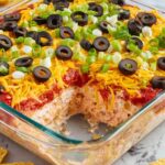 - Top with Olives and Green Onions: Scatter sliced black olives and chopped green onions on top of the cheese layer for a savory and colorful finish.