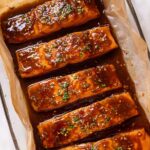- Arrange Salmon and Apply Glaze: Place the salmon fillets skin side down in the prepared baking dish. Reserve half of the glaze in a clean dish, then brush or spoon the remaining glaze evenly over the salmon fillets.