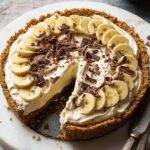 This classic Banoffee Pie features a crunchy digestive biscuit base topped with a rich homemade caramel, layered bananas, and airy whipped cream, finished with a sprinkle of dark chocolate shavings. Perfect for a decadent dessert that combines creamy, sweet, and fruity flavors in each slice.