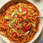 - Garnish and serve: Top the chili garlic noodles with sliced green onions and serve immediately.