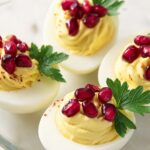 - Garnish and Serve: Top each deviled egg with a parsley stem and 2-3 pomegranate seeds for a festive touch. Serve immediately or refrigerate until ready to serve.