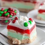 Christmas Lush is a festive layered dessert featuring a buttery nut crust, creamy lime and strawberry gelatin layers, and fresh strawberries, topped with whipped topping and festive decorations. This colorful and refreshing treat is perfect for holiday gatherings and serves a crowd with its 24 generous servings.