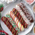 - Coat the marshmallows: Quickly dip or spoon melted brown chocolate over half the marshmallows, and melted white chocolate over the other half, covering them completely except for the candy cane loop. Place them on parchment paper to set.