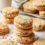 Delicious and festive Christmas Oatmeal Cream Pies made with soft oatmeal cookies studded with colorful sprinkles and filled with a creamy vanilla-almond frosting, perfect for holiday celebrations.