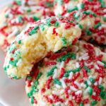 Delight in these festive Christmas Ooey Gooey Butter Cookies, made with a simple cake mix, cream cheese, and butter, coated with powdered sugar and holiday sprinkles for a sweet, soft, and buttery treat perfect for the holiday season.