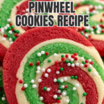 Festive Christmas Pinwheel Cookies featuring layers of colorful red, green, and white dough rolled into a beautiful swirl, coated with holiday sprinkles, and baked to a light golden perfection. Perfect for holiday gatherings or as a cheerful gift.