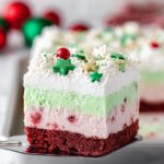 A festive and delicious Christmas Lasagna Dessert featuring a red velvet cookie-like base, layers of cream cheese peppermint filling, green vanilla pudding, and whipped topping, garnished with holiday sprinkles for a perfect holiday treat.