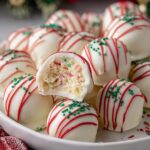 - Decorate the Truffles: Snip the tip of the piping or ziplock bag and drizzle the red candy melts over the white chocolate-coated truffles. Sprinkle green sanding sugar on top immediately.