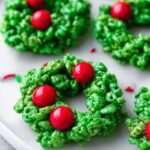 Celebrate the holidays with these festive Christmas Wreath Cookies made from buttery marshmallows, crispy cornflakes, and decorated with red candies to resemble wreath berries. These no-bake treats are easy to make and perfect for holiday parties or gift-giving.