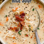 A cozy, one-pot Crack Chicken and Rice Soup featuring tender shredded chicken, hearty white rice, creamy cheeses, and flavorful ranch seasoning that comes together in a comforting, creamy broth.