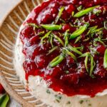 A vibrant and creamy 10-minute cranberry jalapeno dip featuring whipped dairy-free cream cheese, fresh jalapeños, red and green onions, and a layer of whole berry cranberry sauce. Perfect as a festive appetizer served with crackers or chips.