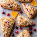 These Glazed Cranberry Orange Scones are tender and flaky with a zesty orange flavor and bursts of tart cranberries, finished with a sweet orange glaze. Perfect for breakfast or a delightful snack, these scones combine the bright freshness of citrus with the cozy richness of buttery dough.