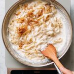 - Combine and cook: Pour cashew cream over pasta and onions. Toss to coat and cook over medium heat for 3-5 minutes, stirring frequently. Thin sauce with reserved pasta water if needed.