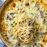- Prepare the Sauce: Preheat the oven to 350 degrees Fahrenheit. In the same pot, melt the butter and add the white wine. Use a silicone spatula to scrape up any browned bits from the bottom of the pot, allowing the wine to gently boil and reduce for 5 minutes. Add diced mushrooms and onions and sauté for 5 more minutes. Stir in minced garlic and cook for an additional minute. Lower heat to medium-low and stir in cream of chicken soup, cream of mushroom soup, Parmesan cheese, sour cream, milk, frozen peas, and the diced cooked chicken. Mix well and gently heat to combine all flavors.