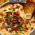 - Garnish and serve: Sprinkle the remaining ¼ cup bacon and chopped green onions on top. Serve the dip warm with sliced baguette, crackers, or chips.