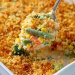 This creamy and cheesy vegetable casserole is a comforting dish loaded with broccoli, mixed vegetables, rice, and a savory cream of mushroom soup base, topped with a buttery Ritz cracker crust. Perfect as a hearty side or vegetarian main, it’s easy to make and great for meal prep.