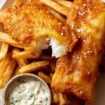 A classic Crispy Beer Battered Fish recipe featuring tender white fish fillets coated in a light, crunchy beer batter and fried to golden perfection. Served with tartare sauce, lemon wedges, and your choice of homemade crispy French fries or baked potato wedges.
