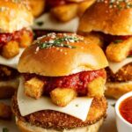 These Chicken Parmesan Sliders are a delicious twist on the classic Italian favorite, featuring juicy breaded chicken breasts topped with marinara sauce, provolone cheese, and crispy mozzarella sticks sandwiched in buttery slider buns. Perfect as a savory appetizer or meal, these sliders combine crispy, cheesy goodness with flavorful seasonings for a crowd-pleasing dish.