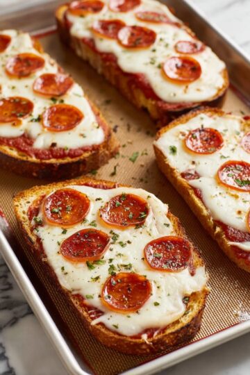 - Add Pizza Toppings: Remove the bread from the oven carefully. Spoon pizza sauce evenly over each slice, then top with shredded mozzarella cheese and pepperoni slices (or toppings of choice).