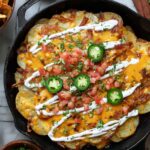 Irish Nachos are deliciously seasoned thinly sliced russet potatoes baked to crispy perfection and generously topped with melted sharp cheddar cheese, crispy bacon, spicy jalapeno, fresh tomatoes, creamy sour cream, shallots, and green onions, making a perfect savory snack or appetizer.