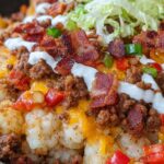 Loaded Tater Tot Nacho Casserole is a deliciously hearty dish featuring crispy baked tater tots layered with seasoned ground beef, sautéed vegetables, crispy bacon, and melted cheese, all baked to perfection for a comforting and flavorful meal.