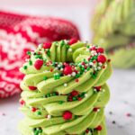 - Pipe the Wreaths: Place the green mixture in a piping bag fitted with a Wilton tip #199 and pipe medium-sized flowers in a circle onto one prepared baking sheet. Use a Wilton tip #4 with another piping bag to pipe little holly berries between the flowers. Sprinkle with Christmas sprinkles if using.