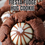Delight in these festive Fiesta Fudge Cookies featuring a rich blend of butter, unsweetened chocolate, and sweetened condensed milk mixed with classic sugar cookie dough and a hint of cinnamon. Each cookie is topped with a Hershey Hugs candy for a charming, chocolate-striped finish, making them perfect for holiday gatherings or any special occasion.