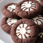 Delight in these festive Fiesta Fudge Cookies featuring a rich blend of butter, unsweetened chocolate, and sweetened condensed milk mixed with classic sugar cookie dough and a hint of cinnamon. Each cookie is topped with a Hershey Hugs candy for a charming, chocolate-striped finish, making them perfect for holiday gatherings or any special occasion.