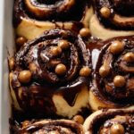 - Cool and Glaze: Remove the rolls from the oven and cool in the pan on a wire rack for 15 minutes. Pour the chocolate glaze over the warm rolls. Optionally, garnish with chocolate pearls, shavings, or sprinkles before serving.
