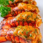 - Finish and serve: Remove the lobster tails from the oven, top with the reserved garlic butter sauce, and serve immediately with lemon wedges on the side.