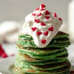 Celebrate the holiday spirit with these festive Green Christmas Pancakes, fluffy silver-dollar sized treats infused with vibrant green food coloring and topped with a creamy sweet glaze, red heart sprinkles, whipped cream, and fresh fruit. Perfect for a joyful breakfast or brunch gathering.