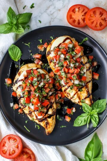 Easy Bruschetta Chicken features tender, seasoned chicken breasts grilled to perfection, topped with a fresh tomato and basil bruschetta mix, melted mozzarella cheese, and a drizzle of sweet balsamic glaze for a flavorful and vibrant meal.