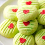 These Grinch Christmas Cream Cheese Mints are festive, colorful, and bursting with peppermint flavor. Soft cream cheese mixed with a hint of butter, peppermint extract, and neon green food coloring creates a dough that’s rolled into bite-sized balls, pressed flat, topped with red heart sprinkles, and chilled until firm. Perfect for holiday parties or gifting during Christmas time.