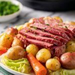 - Slice and Serve: Trim excess fat from the corned beef and slice against the grain. Arrange the sliced beef on a serving platter and drizzle with some cooking liquid. Transfer the cooked vegetables to the platter or a bowl. Toss with butter, salt, and pepper. Garnish with chopped parsley if desired. Serve with whole grain mustard on the side.