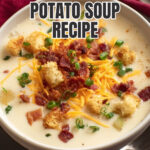 A creamy, comforting Loaded Baked Potato Soup packed with tender potatoes, crispy bacon, sharp cheddar, and a blend of rich cheeses, topped with fried potato skins and green onions for a deliciously hearty meal.