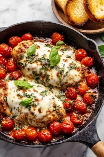 Place the chicken breasts right in the center of a 12” oven-safe skillet. Scatter your juicy tomato mixture all around the chicken, then slide it into a hot 425°F oven. Bake anywhere from 18 to 24 minutes until the chicken hits 165°F internally. Then sprinkle mozzarella over the top and bake until melted—just a couple more minutes and you’ve got golden, bubbly cheese perfection.