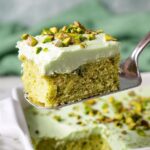 - Frost and Garnish: Once the cake is fully cooled, spread the pistachio pudding frosting evenly on top. Sprinkle with chopped pistachios if desired for added texture and flavor.