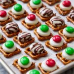 - Bake for Melting Chocolate: Bake the pretzels with the chocolates in the preheated oven for 5 minutes, until the chocolates are shiny and soft but still hold their shape.