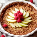 A delightful Raspberry Apple Pie featuring a sweet and tart fruit filling nestled in a Brown Sugar Pecan Graham Cracker crust, topped with a buttery oatmeal cookie crumble for a perfect balance of textures and flavors.