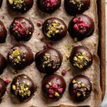 - Decorate: While the coating is still wet, decorate the truffles with cacao nibs, chopped pistachios, or extra freeze dried raspberries as desired. Allow the chocolate coating to fully set; refrigerate if preferred for faster setting.