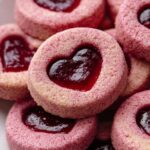 Delight in these charming Raspberry Heart Thumbprint Cookies, featuring a tender buttery base infused with vibrant freeze-dried raspberry powder and filled with luscious raspberry jam. Perfect for gifting or sharing, these cookies combine a soft crumb with a pop of fruity sweetness in a pretty heart-shaped thumbprint.