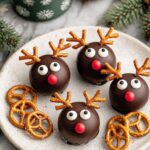 These festive Reindeer Oreo Balls are a delightful no-bake treat perfect for holiday parties. Made with crushed Oreo cookies and cream cheese, dipped in rich dark chocolate, and decorated with pretzel antlers, candy eyes, and a red candy nose, they are both adorable and delicious.