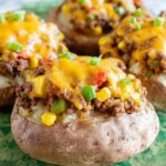 - Stuff and Top: Spoon the beef and vegetable mixture evenly into the opened potatoes. Sprinkle the shredded cheddar cheese on top of each stuffed potato.