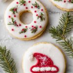 Delicious and festive shortbread cutout cookies perfect for holiday celebrations. These buttery cookies are decorated with vanilla icing, white chocolate, rosemary sprigs, and colorful sprinkles to create beautiful wreaths and Santa hat designs.