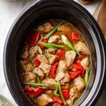 A flavorful Slow Cooker Salt & Pepper Sticky Chicken recipe featuring tender chicken breast chunks cooked in a savory soy and tomato ketchup sauce, accented with ginger, Chinese five spice, and black peppercorns. Finished with crunchy red peppers and spring onions, this easy slow cooker dish pairs perfectly with rice or noodles for a comforting meal.