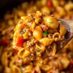 A simple and flavorful slow cooker taco pasta recipe featuring ground beef, bell pepper, tomatoes, salsa, corn, and taco seasoning simmered to perfection, then combined with pasta and cheddar cheese for a comforting, cheesy meal.