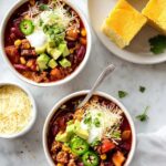 - Serve with toppings: Serve the chili hot with optional toppings such as green onions, shredded cheese, avocado slices, and a dollop of sour cream or Greek yogurt.