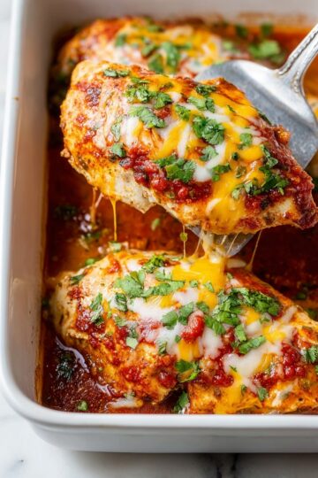 Take the dish out, let the chicken rest for 5 minutes—this lets the juices settle so every bite stays moist. Finish with a sprinkle of fresh chopped cilantro for a bright, herbaceous touch, then serve warm and enjoy!