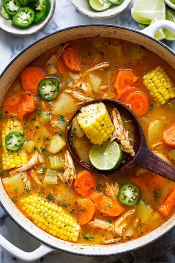 Caldo de Pollo is a comforting and flavorful Mexican chicken soup featuring tender chicken pieces simmered in a rich, savory broth with hearty vegetables like carrots, celery, corn, and potatoes. This wholesome soup is garnished with fresh cilantro and lime for a refreshing finish.