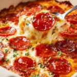 This delicious Pizza Dip blends creamy layers of cream cheese and sour cream with classic Italian herbs, marinara sauce, melted mozzarella and parmesan cheeses, and pepperoni slices. Baked until bubbly and golden, it's perfect for dipping crusty bread, chips, or veggies and makes an easy, crowd-pleasing appetizer or snack.